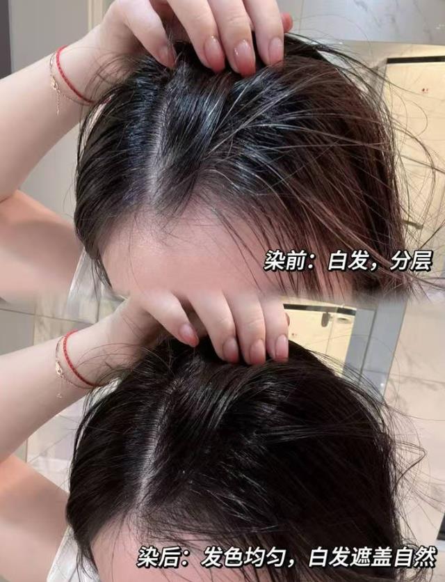在盖白发这个硬指标上,它交出的成绩单是99.9%。不管你是零星的白发还是大面积的花白,上色都非常均匀,色彩饱满自然,染完就是那种很健康的发色光泽。操作过程更是简单到让人惊喜:膏体挤出来是顺滑的质地,带着淡淡的草本香,完全没那股刺鼻味。直接戴上手套,把膏体往头发上揉搓均匀,像平时洗头一样揉开,等15分钟冲洗掉就搞定,无需调配,一个人在家对着镜子也能操作。染一次颜色能稳稳待上90天,不用频繁补染折腾头发。