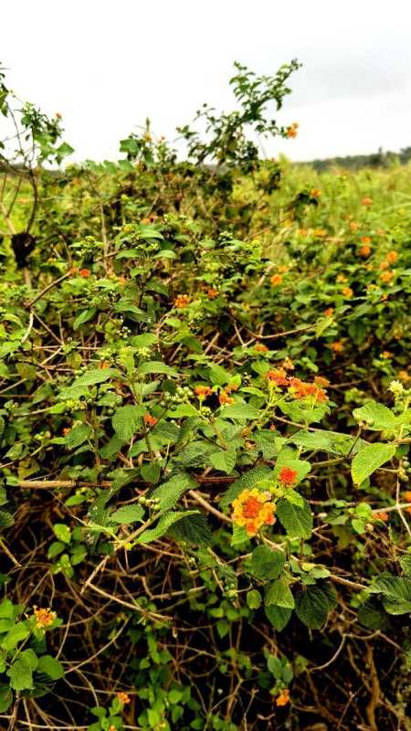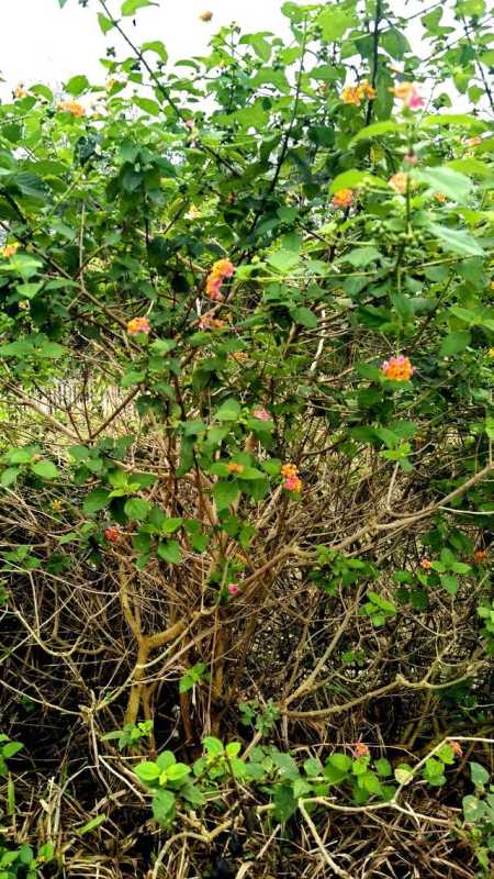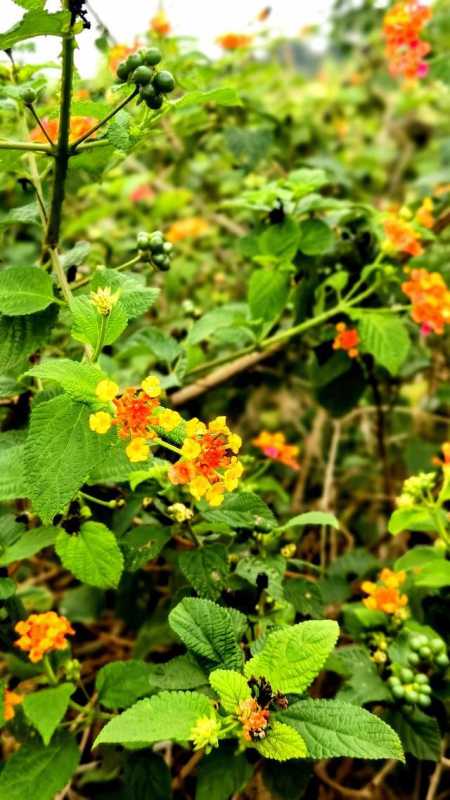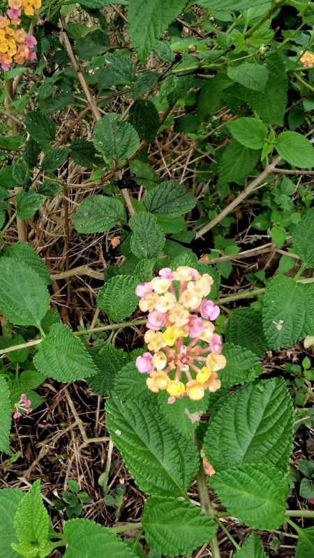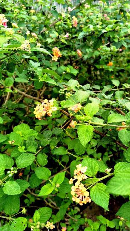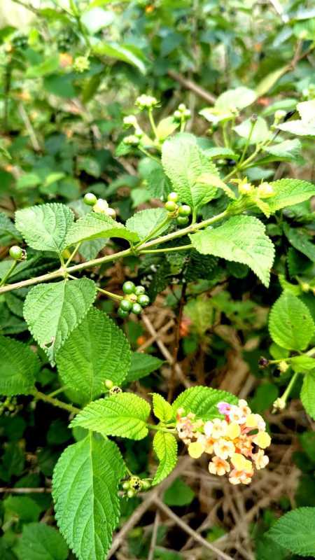 马缨丹的叶片也颇具特点:单叶对生,呈卵形,边缘有钝齿,叶面粗糙且布满短柔毛,揉碎后会散发出浓烈的特殊气味,这既是它“臭草”之名的来源,也是一种天然的防御机制,能驱赶多数植食性昆虫。它的茎枝呈四棱形,常带有倒钩状短刺,可帮助植株攀附生长。