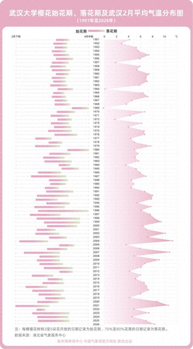 武汉大学樱花观测数据记录始于1947年,是国内较为少有的长序列物候观测资料。观测记录显示,2004年与2021年,武汉2月气温突破历年新高,武汉大学的樱花也随之在2月提前绽放。而1969年因寒冬持续,武汉大学的樱花推迟至4月4日才开放。截至目前,今年武汉大学樱花武汉大学樱花初花期尚未到来。
