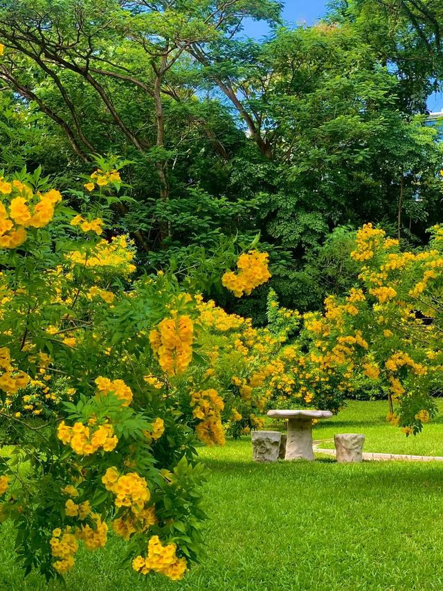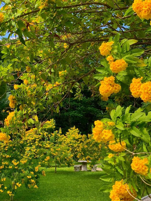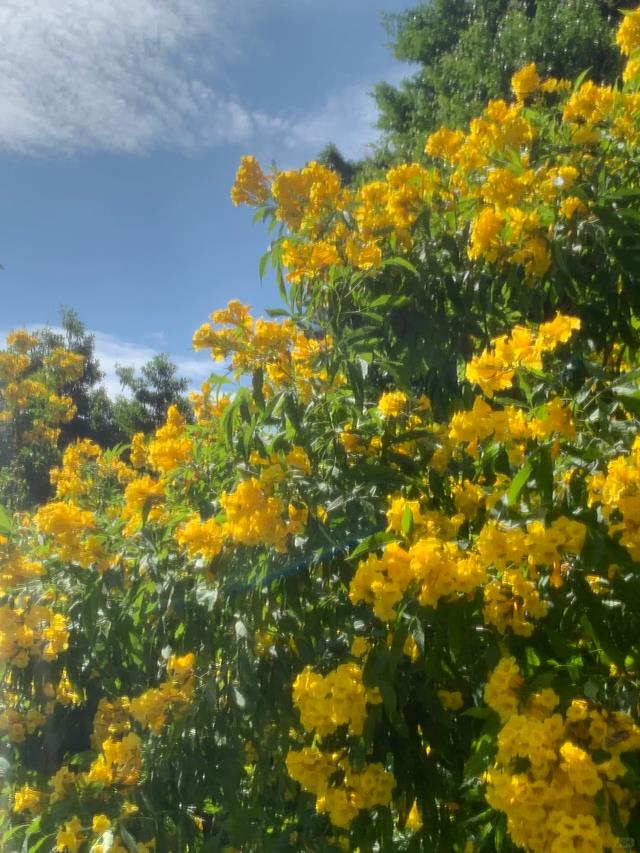 它的花是明晃晃的金黄色,阳光下会发光那种。形状像小钟,一串串挂在枝头,风一吹满树摇曳。