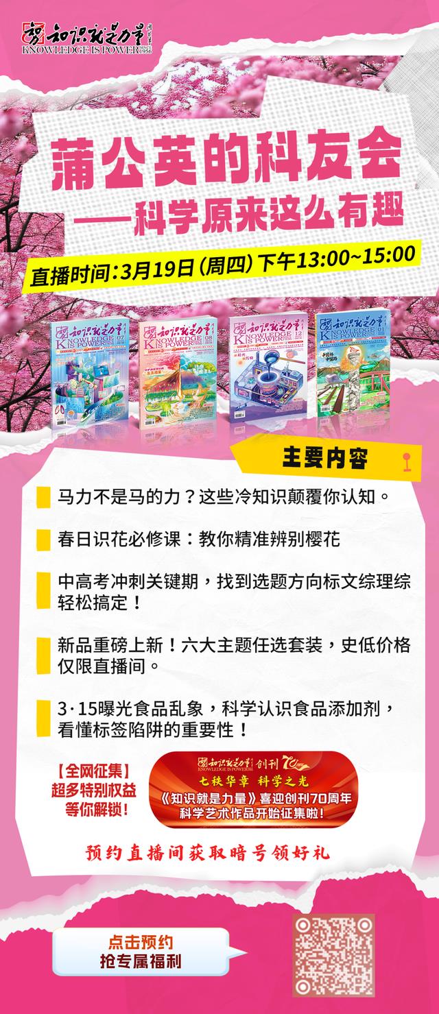 想了解更多丰富有趣的科普知识,点击下方预约,3月19日13:00《知识就是力量》官方直播间,期待和您相见。