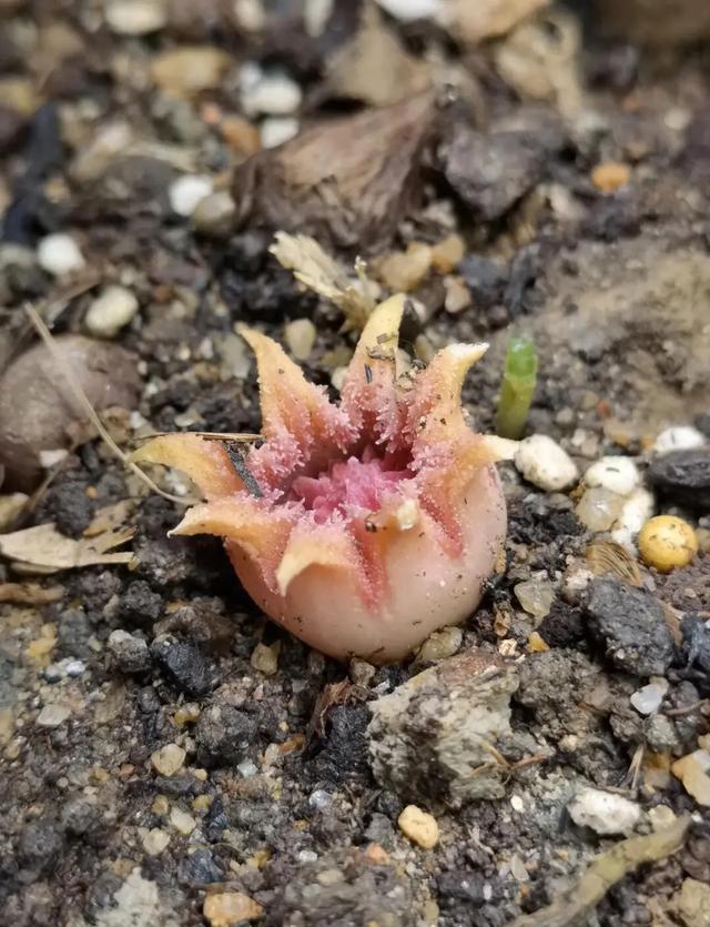 · 花(关键特征): 花葶(总花梗)极短,长仅0.3-1厘米,常贴近地面开放。花被钟状,具8-10裂。其最独特的识别点在于花被筒内壁:具有4条裂成流苏状的肉质脊状隆起,这也是“流苏”之名的由来。花外面具紫色细点,柱头盾状膨大,呈紫色,直径7-10毫米,中央明显凸出。