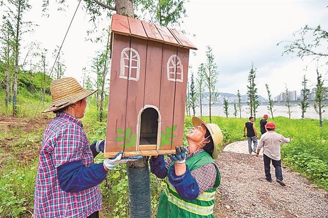 工作人员为栖息在消落带的野生鸟类安置“新家”。