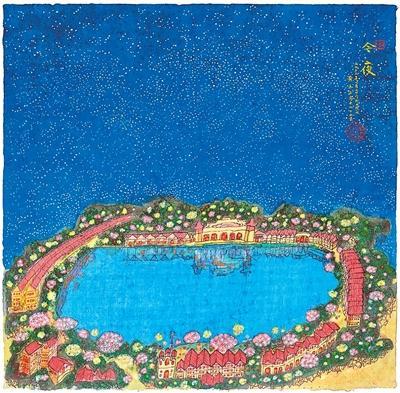 如果说《小夜曲》是黄永玉“我与你”的告白,那么《今夜》便是“我与世界”的宣言。画面中,湖畔宁静,繁星满天,万家灯火与绚烂烟花交相辉映,营造出一种平和而温暖的氛围。他在题跋中写道:“愿上天给人间每个人都有美好的今夜,天天如此,月月如此,年年如此,十年如此,百年如此。告诉子孙们,人应该拥有如今夜之权利,过宁馨如今夜之日子。”