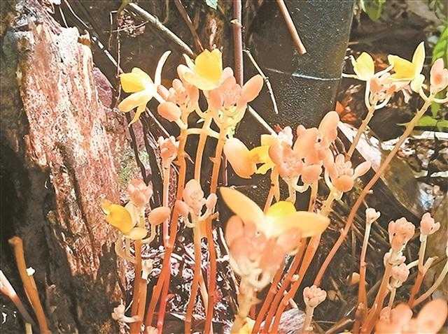 矮小肉果兰是兰科中极其稀有的腐生性物种,全株不含叶绿素,无法进行光合作用,完全依赖地下真菌网络获取养分。它通常在开花结果时短暂露出地面,其余时间隐藏于地下与真菌共生,完整生命周期至今仍是植物学界未解的演化密码。2025年,广西七冲国家级自然保护区发现了多达22株聚生的矮小肉果兰,腐殖质层厚达30厘米,真菌菌丝如银色神经网络密布地表。这种植物被誉为森林生态系统健康的“活体检测仪”——它存在的地方,说明整个地下微循环是完整的。