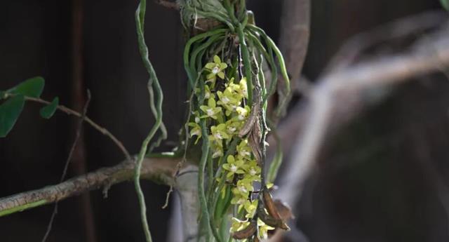 广东异型兰是极危兰科物种,它的“奇”在于——它没有叶!茎极短,依靠许多扁平且长而弯曲的根附着于树干生长。花色别致,开花时抽出1-2个下垂的总状花序,疏生数朵黄豆大的黄色小花。更离谱的是,它完全依赖林间特定湿度、植被群落和共生真菌,离开原生环境无法存活,被誉为衡量区域生态环境质量的指示物种。2026年3月,福建戴云山保护区发现了一个大型种群,十余棵灌木上附生了数十丛,是极其罕见的发现。