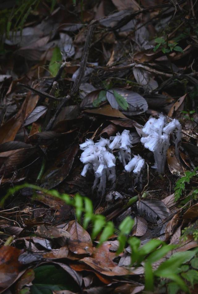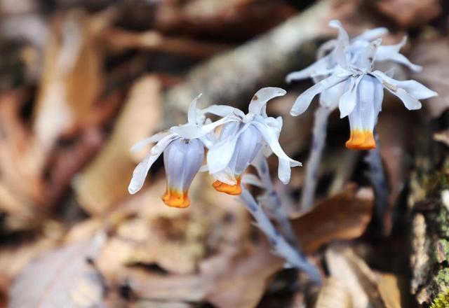 这是本文中最“新”的植物——2026年3月才被正式发表为植物新种。与普通水晶兰不同,美冠水晶兰花瓣下部约四分之三呈纯白色,顶部四分之一带有明亮的橙黄色,像镶了一圈暖色花边。它的花期更早(3月就能见到),结出的果实是浆果而非普通水晶兰的蒴果。目前仅在湖南舜皇山国家级自然保护区被发现,是全国乃至全世界最稀有的“幽灵之花”之一。