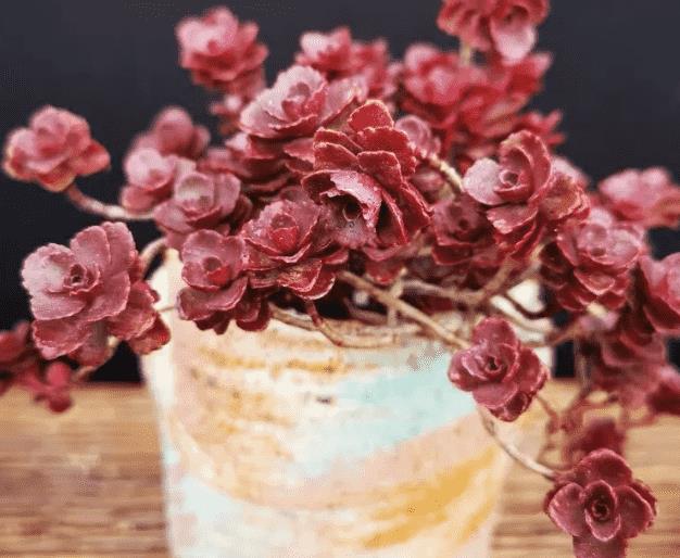 小球玫瑰又叫龙血景天,是景天科费菜属多肉植物,它植株玲珑,叶色在昼夜温差大、阳光充足的条件下,由绿变成紫红色,叶色鲜艳,红彤彤的十分惹人喜爱,可媲美玫瑰.
