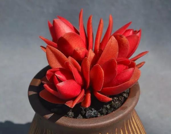 火祭又叫秋火莲、红景天,是景天科青锁龙属多肉植物。火祭容易丛生,它的肉质叶片呈长圆形,交互对生紧密的排列在一起,使植株呈四棱状。火祭的叶面有毛点,在阳光充足、昼夜温差大的环境下,叶色由浅绿色变成深红色,如燃烧的火焰般鲜红夺目,给人一种蓬勃向上、热情奔放的感觉,颇具热带风情,令人眼前一亮,极富感染力和活力。