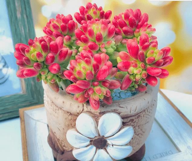 虹之玉又叫耳坠草,是景天科景天属的多年生肉质草本植物,它的小叶片肥厚呈水滴状态,普通状态下是绿色,多片小叶子组合在一起,像一串串绿葡萄,出状态以后,葡萄便“成熟”了,叶子会变成红色并带着漂亮的果冻质感。