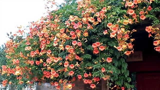 凌霄花就是这样的典型,它能沿着墙面爬得高高的,花开时满墙火红,好看得让人舍不得剪。