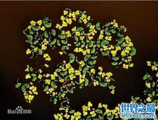 无根萍”又称「卵萍」、「芜萍」、「微萍」、「水蚤萍」等,外观像绿色的鱼蛋,身长不超过一公厘开的花也只有针尖般小。无根萍共创下了三个世界纪录:一、全世界最小的开花植物;二、全世界花最小的植物;三、全世界果实最小的植物。