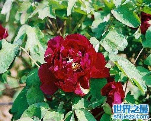 牡丹名贵品种“洛阳红”又名“紫二乔”、“普通红”。花艳紫红色,为丰花品种,一株能开百朵花,璎珞满身。花繁叶茂,被冠以“新花后”的美称。