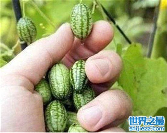 但是这里的西瓜就不一样了,它是一种非常小的西瓜。虽然这种西瓜的外形看上去和我们平时所吃的那种西瓜没有什么区别,但是它的个头却是超级小的,直径为2cm,长度也仅仅只达到3cm,拿在手上像拿个迷你版的玩具一样!