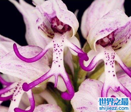 外形奇葩的意大利红门兰,是地生的草本植物,一般只有20到50厘米那么高。这种奇特的花,除了花瓣外形像男人,它还有止泻、抗胀气和壮阳的功效。因此这种花被大量采摘,现在已经属于稀有濒危植物了。不过,在希腊旅游胜地克里特岛上,这种花还比较多。