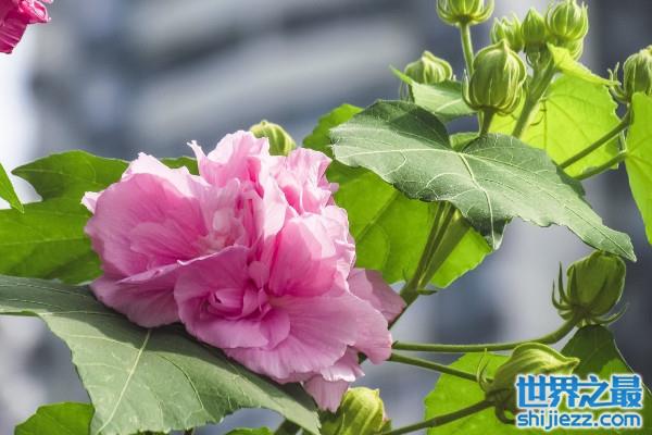木槿花是锦葵属落叶植物,树姿挺立生长且分枝较多,花期时间在秋季9-11月份,淡紫色或是紫红色的花朵单生在叶腋间。