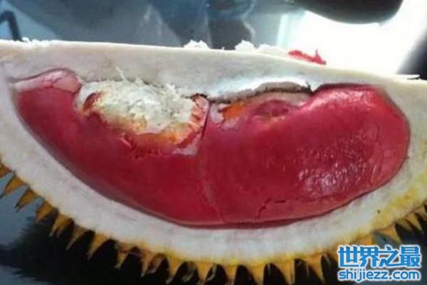 红色榴莲只产于马来西亚的沙巴州的森林里,要四到六年才会结果,比猫山王还要稀有,其价格也比较高,据说味道与金枕头相差不大。