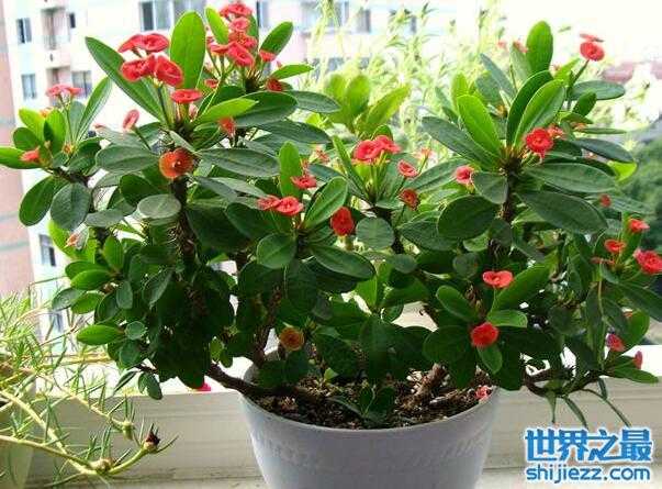 虎刺梅的生命力非常强悍,是懒人的必选植物之一,另外虎刺梅的花期也特别长,在虎刺梅开花之时,蝴蝶似的小红花,每两瓣为一小朵,就像一对情侣,很远就闻它的花香。