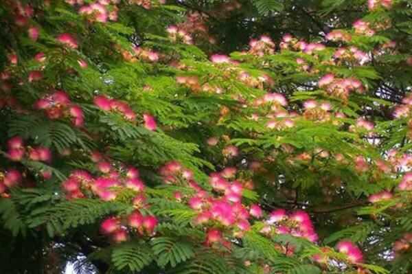 合欢树又被称为马缨花、绒花树,是以每年6至7月为开花期的蔷薇目豆科植物,在每年开花时,开阔的树冠上会开满粉红色的香气袭人的圆锥状花序,并因抗毒性强、耐寒耐旱耐土壤瘠薄,而成为最美观的十大绿化树种之一。
