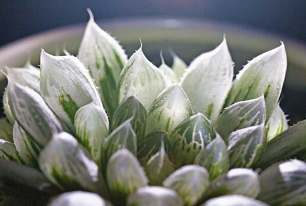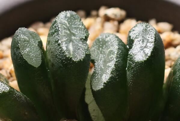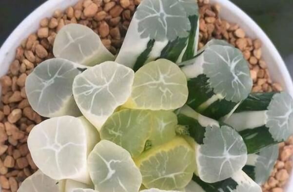 这个无茎,肉质叶片排成两列呈扇形而得名的阿福花科瓦苇属多年生草本植物,在肉质叶片截面上分布着灰白色透明状花纹,园艺品种叶片上可能还会有黄色或粉红色的斑纹,是一种较为珍奇的观赏花卉品种。