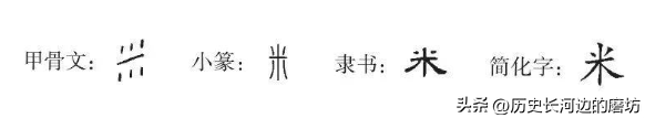 稻,今天以米或大米称之,在甲骨文中,“米”的写法如图,几个米料状,中间加一横(为与小与少字区别),指的是去壳的谷仁,黍、稷、稻的谷仁均可称为“米”。