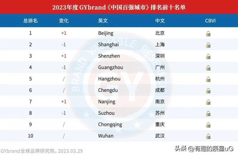 根据2023年度GYbrand发布的《中国百强城市》排名,前十名单如下:北京、上海、深圳、广州、杭州、成都、南京、苏州、重庆、武汉
