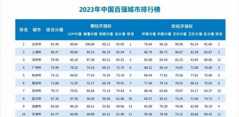 相关资料显示,这份城市衡量榜单主要由硬经济指标和软经济指标所组成。其中,硬经济指标由GDP总量、储蓄、财政三大领域组成,而软实力指标由环境、科教、文化、卫生四大领域所组成。