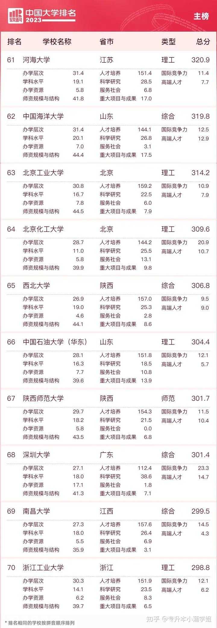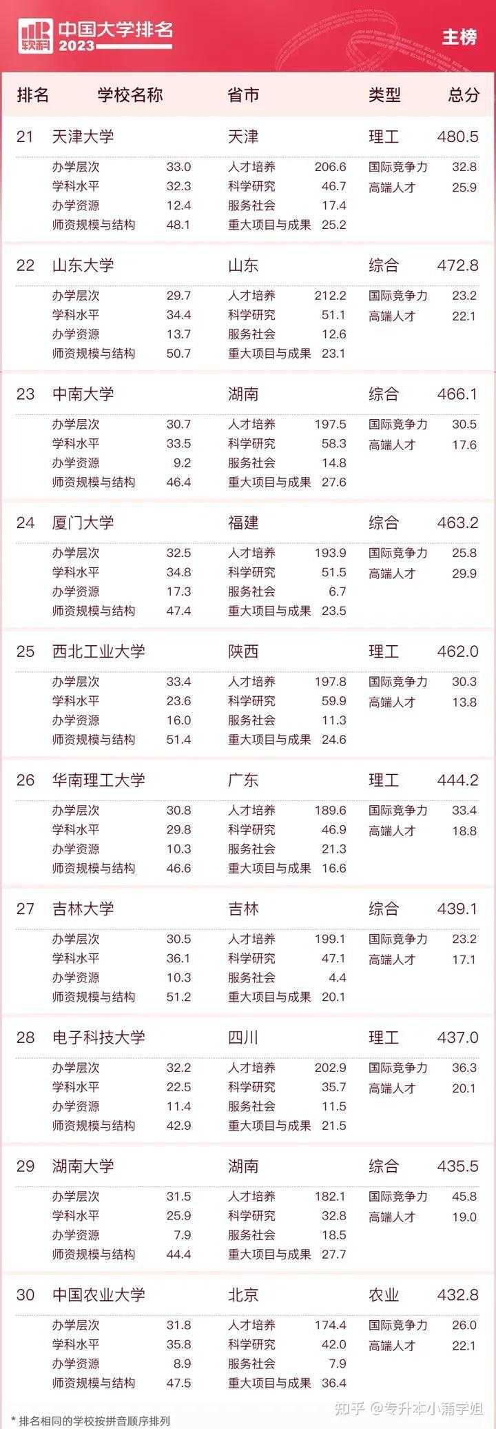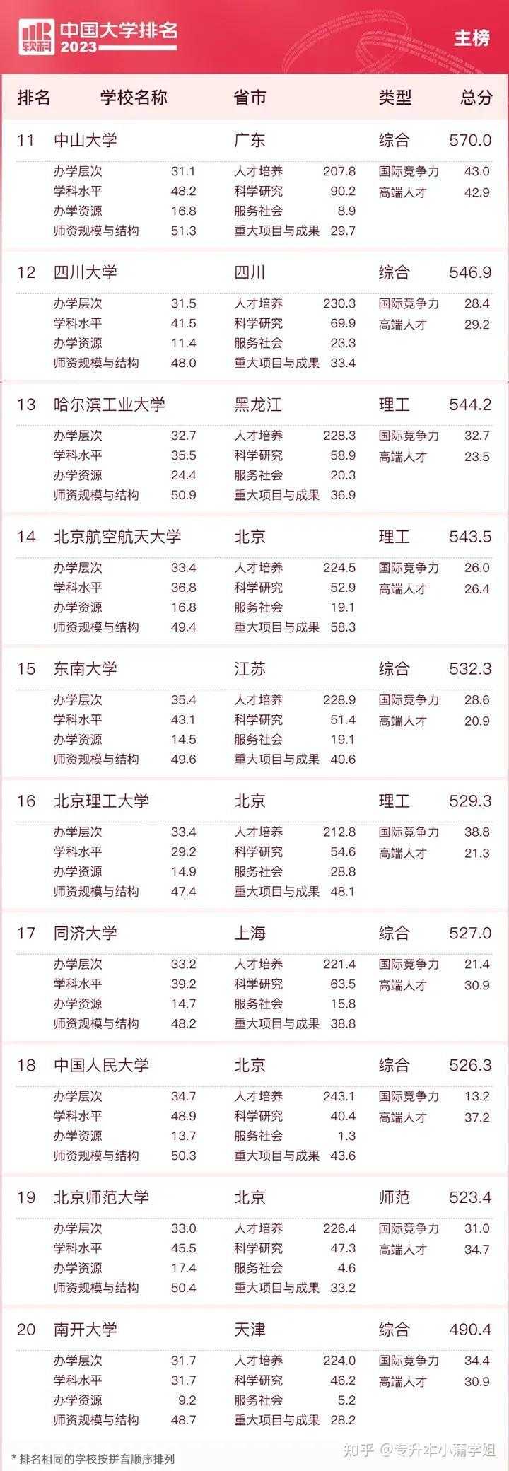 除了上述十所学校外,中国大学排名前100名的大学基本上都是985、211、双一流大学,例如排名10~20名的大学有四川大学、中山大学、哈工大、北师大、东南大学等等。