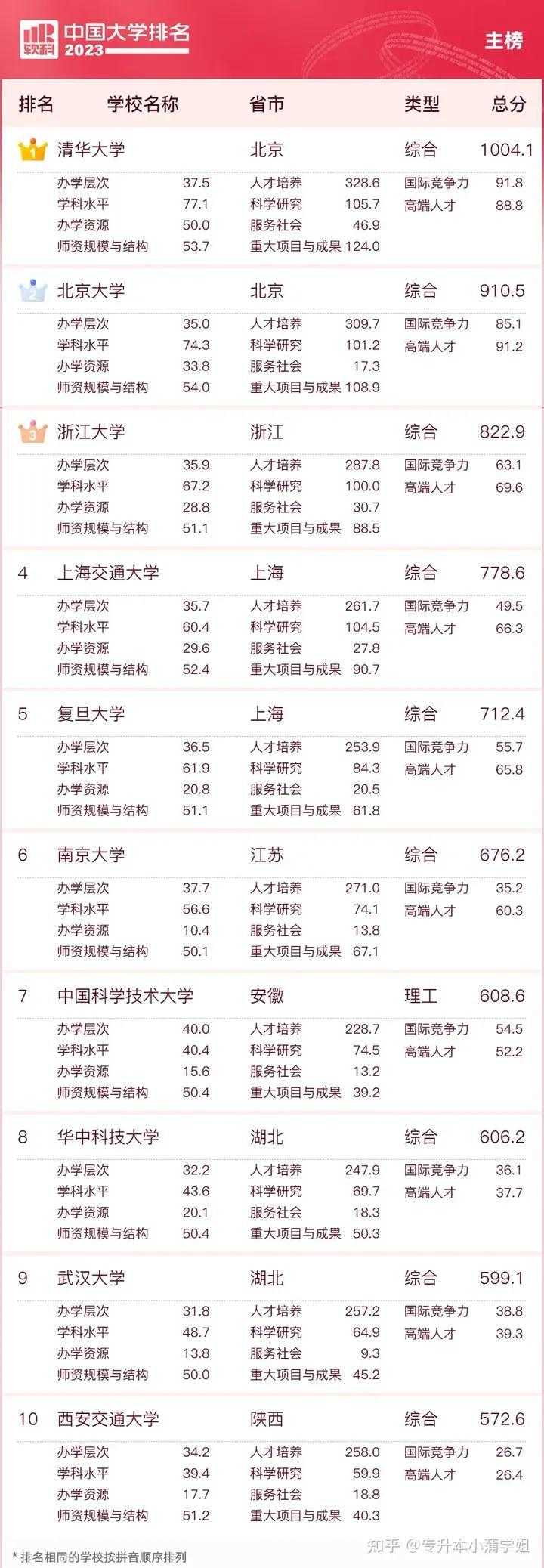 中国大学排名最新完整榜单(前十名,前100名名单)