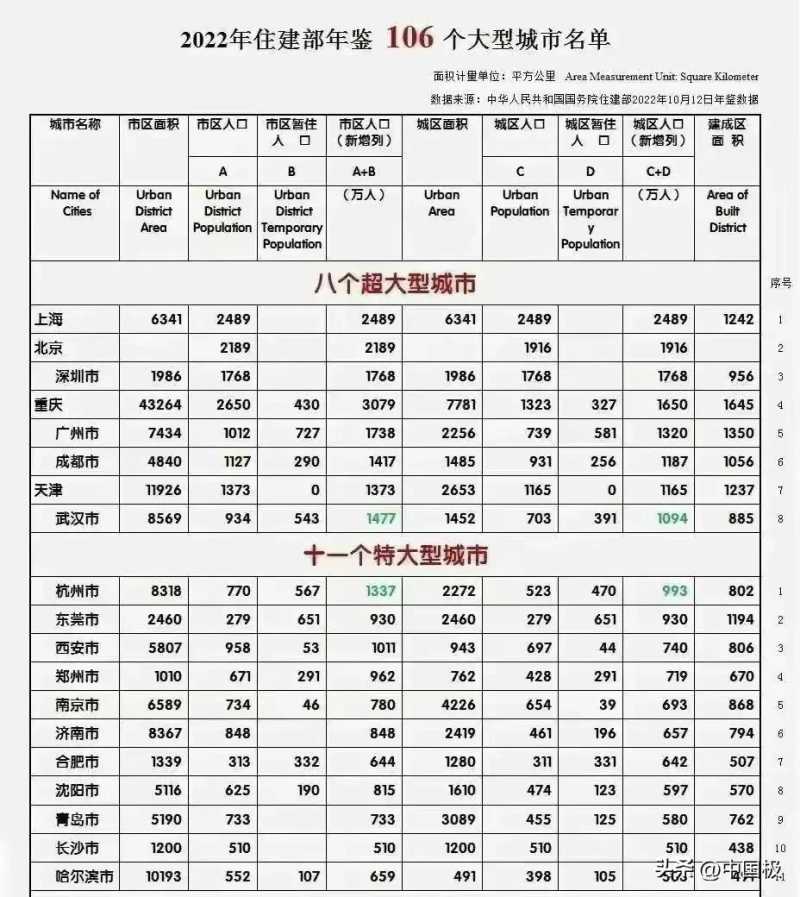 按照国务院住建部《2022年住建部年鉴》公布的大型城市名单。我国共有8个超大城市和11个特大城市。其中,前10大城市依次为:上海、北京、深圳、重庆、广州、成都、天津、武汉、杭州、东莞。包含了8个超大城市和两个特大城市。