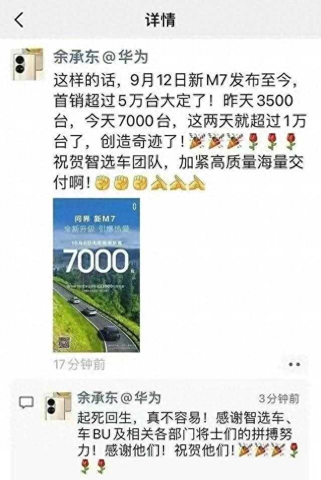 据官方数据,华为问界M7的大定数量破5万台,日均新增大定数接近2000台。而今年上半年华为M5的累计销量仅为17067辆,平均每月仅售出2000~3000台。