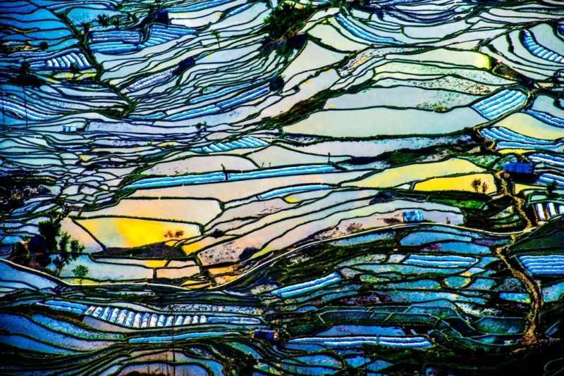 待到太阳升起,随着光线的变化,一块块梯田像极了彩色的碎片,构造出一幅完整的光影图。