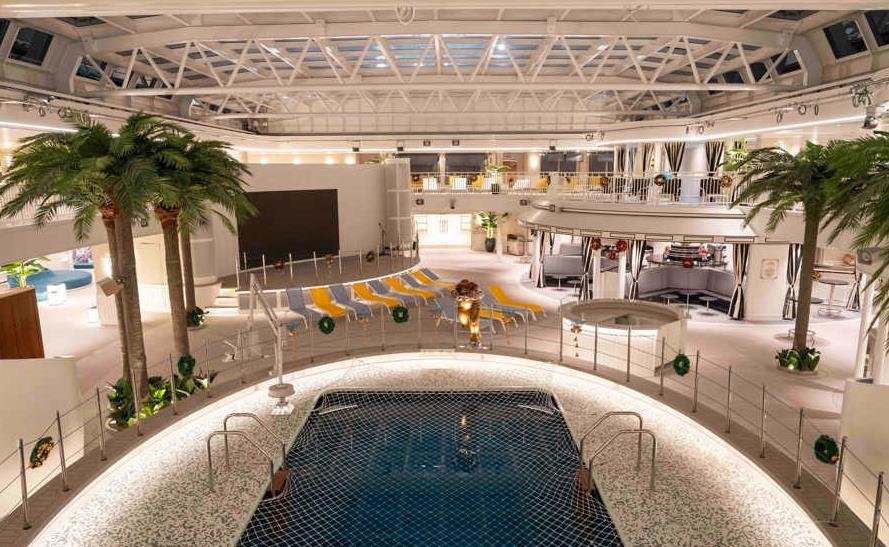 上图是“爱达·魔都号”第十层的海滩俱乐部,“爱达·魔都号”全长323.6米,总吨位13.55万吨,拥有2125间豪华客房和套房,满载可容纳5246名宾客。该船拥有26个不同风格口味的餐厅,有多个免税店、健身房、棋牌室、大剧院、迷你高尔夫球场、篮球场、游戏房、儿童乐园、室内泳池、水疗中心等各类休闲娱乐设施。