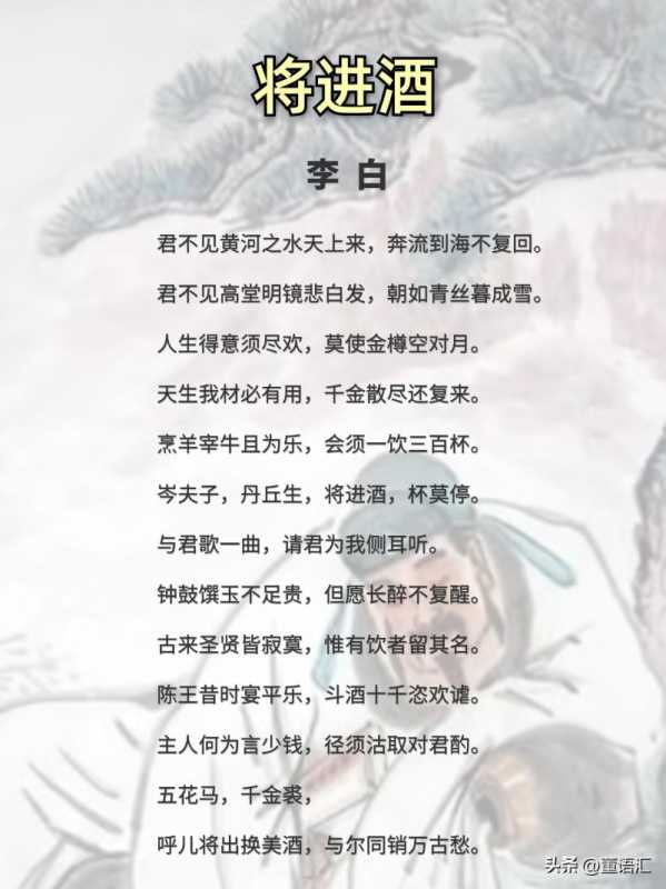 《将进酒》是李白的代表作之一,这首诗通过描绘美酒与欢歌,展现了诗人豪放不羁、激情四溢的个性。李白借酒抒发对人生短暂的感慨,和及时行乐的情感,同时也表达了对壮志难酬的愤懑和无奈。