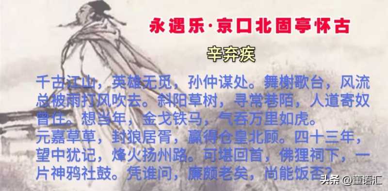 《永遇乐·京口北固亭怀古》是辛弃疾词的巅 (dian) 峰之作,抒发了作者满腔报国之志和内心悲愤苍凉之情。明代杨慎评价说:“辛词当以京口北固亭怀古《永遇乐》为第 (di) 一。”