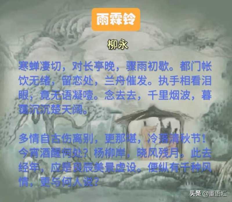 《雨霖铃》是柳永的代表作,“以伤感之哀弦,奏别离之韵调”,被后人誉为送别词曲中的绝唱,堪称空 (kong) 前绝后。