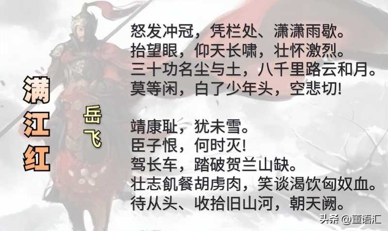 和辛弃疾一样,岳飞也是文武双全。他的不朽传奇词作《满江红》,展现了作者强烈的爱国精神,坚决抗击金兵,努力收复故土,并致力于统一祖国。