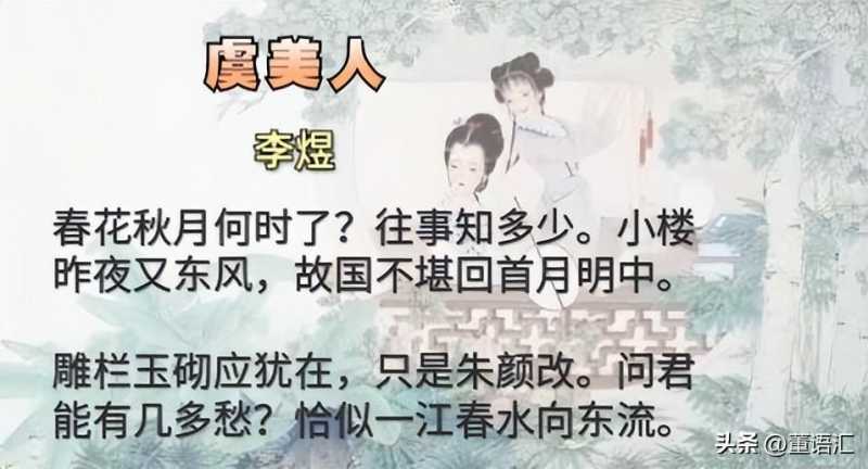 宋词婉约派名作《虞美人》,是李煜的绝命词,意境深远,哀婉凄恻,乃词中佳品。可惜,就是因为那句“故国不堪回首月明中 ”,宋太宗赵光义毒死了一代词帝李煜。