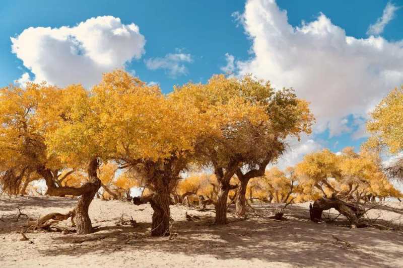 一株株古树,一片片金叶,沾着沙、染着水,于苍凉中带着些许秀美,处处都是无法用语言描述的绝美画面。