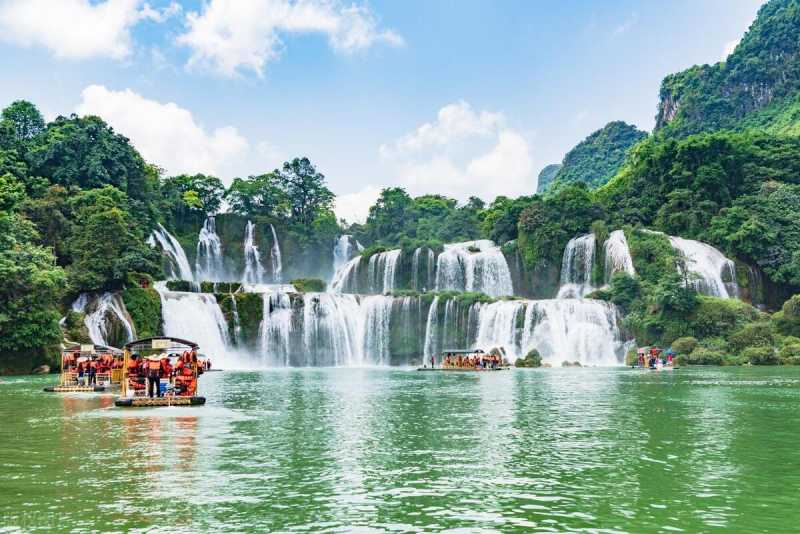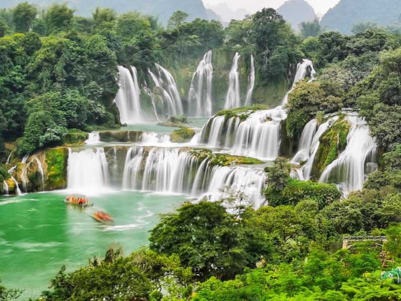 德天跨国大瀑布,横跨中国和越南两个国家,瀑布非常壮观,高低落差很大,登上观景台,可以听到瀑布飞泻而下的轰鸣声,还可以坐船游览,近距离观看大瀑布,天气好的话,还可以看到彩虹,超浪漫!