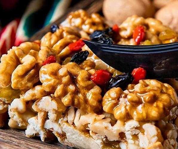 切糕是新疆的传统甜点,以核桃仁、玉米饴、葡萄干、杏仁等为原料制成。这种甜点口感丰富、甜而不腻,是新疆人民喜爱的美食之一。切糕的制作工艺复杂,需要经过多道工序才能制成。每一块切糕都凝聚了新疆人民的智慧和辛勤劳动,是新疆文化的瑰宝。