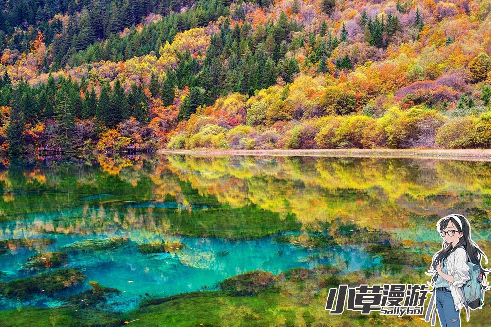 九寨沟的秋天,宛如一幅绚丽的油画,湛蓝的天空下,湖水变得更加澄澈多彩。