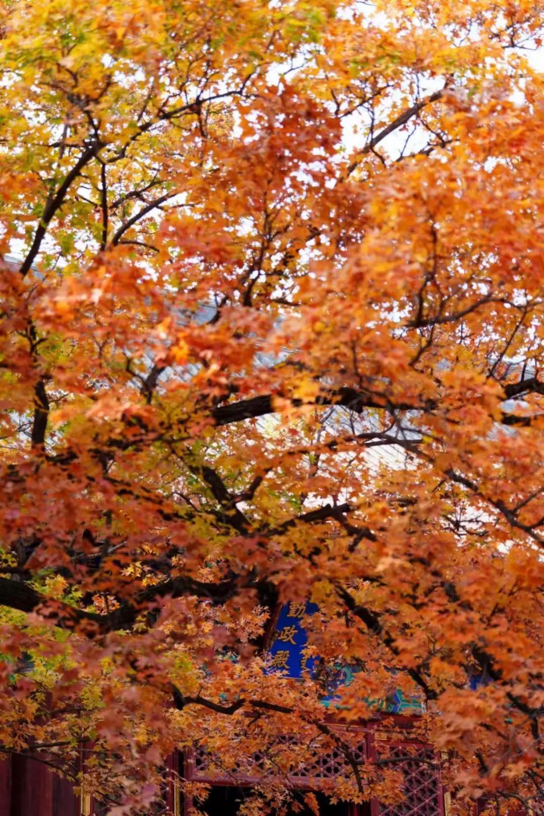 山上的树木换上了五彩斑斓的秋装,金黄的银杏、火红的枫叶与翠绿的松柏相互映衬。