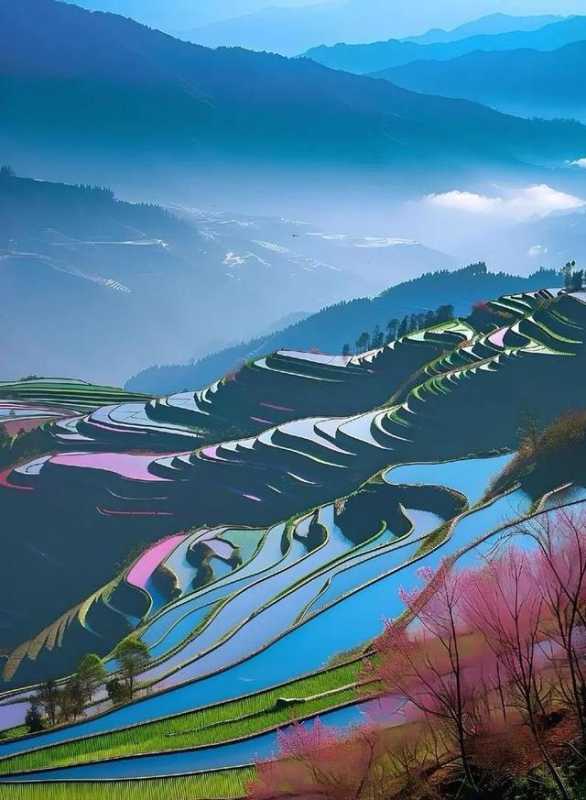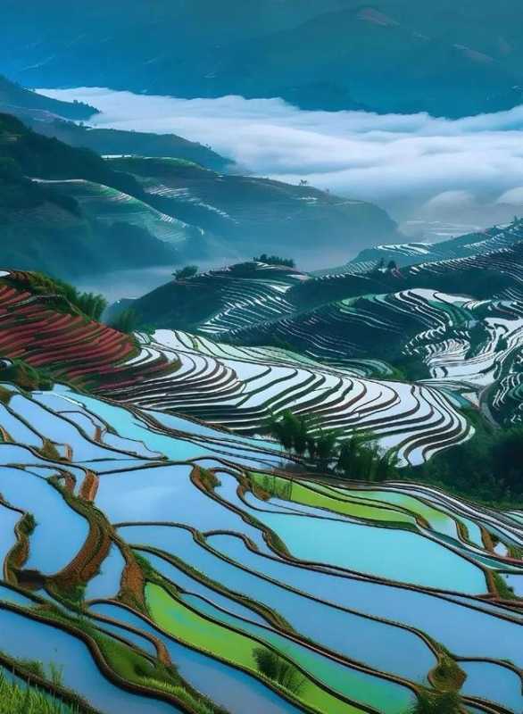 哈尼族老少爷们花了1300多年硬是在哀牢山的陡坡上一锄头一锄头刨出了这片梯田。 每年11月到第二年4月是灌水季梯田灌满了水像无数面大大小小的镜子铺在山坡上。 太阳升起或落下那会儿天上的彩霞、飘动的云朵全都映在水田里光影变幻看得人挪不动步真怀疑自己是不是还在人间。