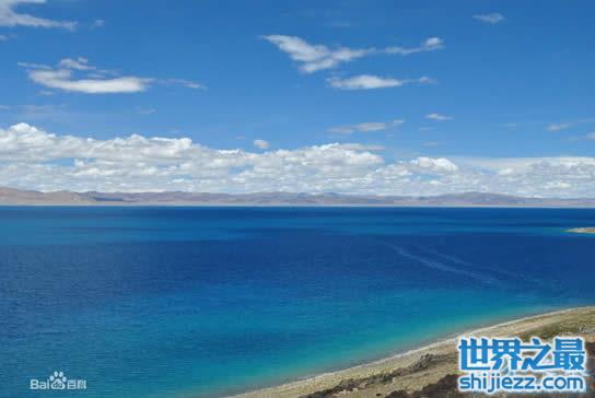 纳木错湖,中国排名第三的咸水湖,位于西藏拉萨西北部,也是西藏第二大湖泊,湖面海拔4718米,形状近似长方形,东西长70多千米,南北宽30多千米,面积1920多平方千米。是我国海拔最高的咸水湖。纳木错的最大深度为33米,但最近两年对湖泊的重新测量发现,纳木错最深处超过了120米。蓄水量768亿立方米,是中国海拔最高的湖,也成为世界上海拔最高的湖泊,中国的又一个关于湖泊的世界之最。