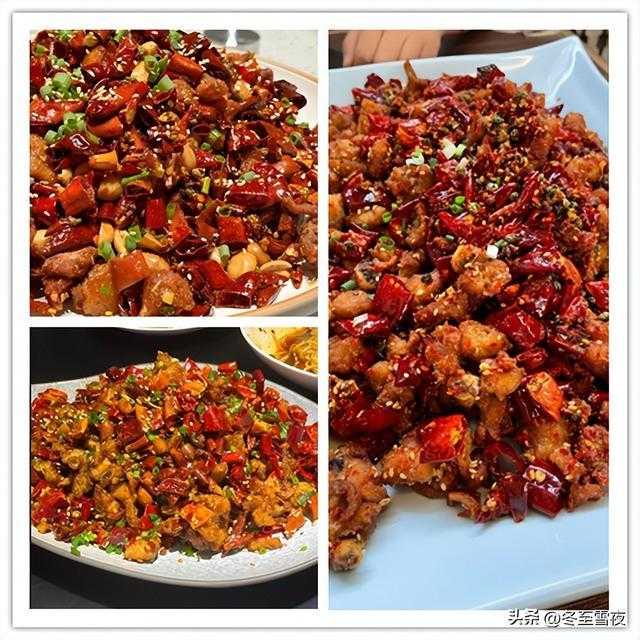 一道经典的川渝名菜,以其麻辣口感著称。以辣椒用量远超鸡肉为特色,主料多选用鸡腿或三黄鸡,配以干辣椒、花椒等调料,成品色泽红亮,口味麻辣鲜香 ,鸡肉外酥里嫩,干香麻辣,嚼劲十足。红彤彤的辣椒堆里寻找金黄酥脆的鸡块,是吃这道菜的乐趣所在。