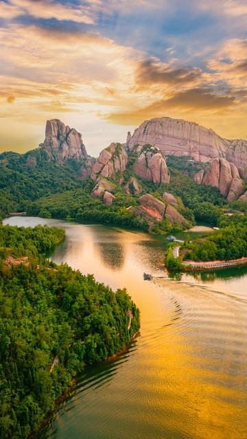 水上丹霞代表作;游船穿行赤壁丹崖,甘露岩寺“一柱擎天”凌空而建;上清溪竹筏漂流,光影入画。