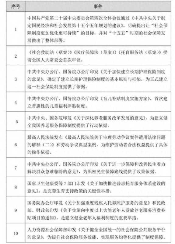 入选事件依次为:中国共产党第二十届中央委员会第四次全体会议通过《中共中央关于制定国民经济和社会发展第十五个五年规划的建议》;《社会救助法(草案)》《医疗保障法(草案)》《托育服务法(草案)》提请全国人大常委会首次审议;中共中央办公厅、国务院办公厅印发《关于加快建立长期护理保险制度的意见》;中共中央办公厅、国务院办公厅印发《育儿补贴制度实施方案》;中共中央、国务院印发《关于深化养老服务改革发展的意见》;最高人民法院发布《最高人民法院关于审理劳动争议案件适用法律问题的解释(二)》和劳动争议典型案例;中共中央办公厅、国务院办公厅印发《关于进一步保障和改善民生着力解决群众急难愁盼的意见》;国家卫生健康委等7部门印发《关于加快推进普惠托育服务体系建设的意见》;国务院办公厅印发《关于加强重度残疾人托养照护服务的意见》和民政部、财政部印发《关于实施向中度以上失能老年人发放养老服务消费补贴项目的通知》;人力资源社会保障部印发《关于健全全国统一的社会保险公共服务平台的意见》。