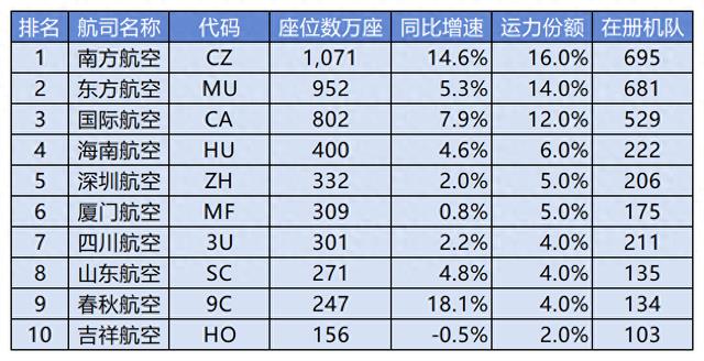 十大航司承包国内62%的运力,三大航直接占了 42%;
