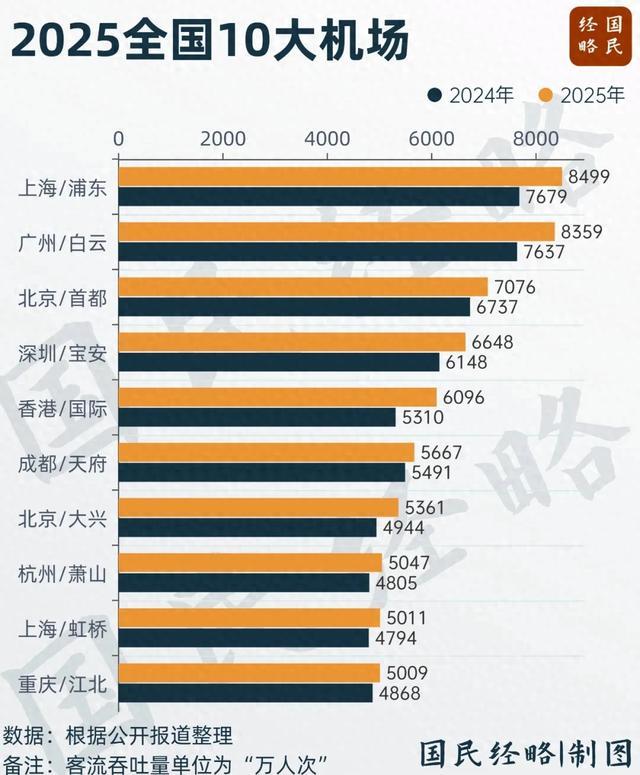 总体来看,全国10大机场的门槛,已从2019年的4000万人次,提升到2025年的5000万人次。